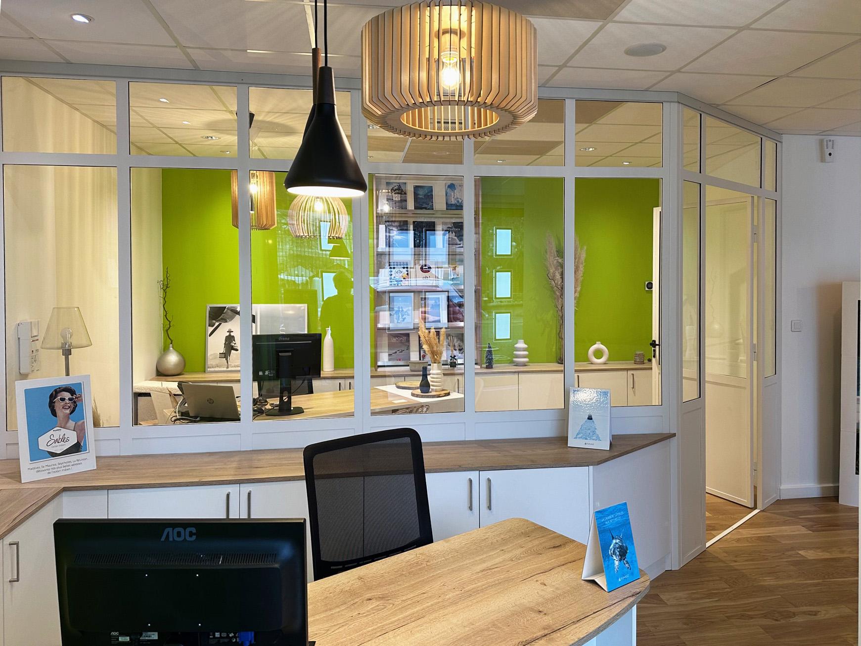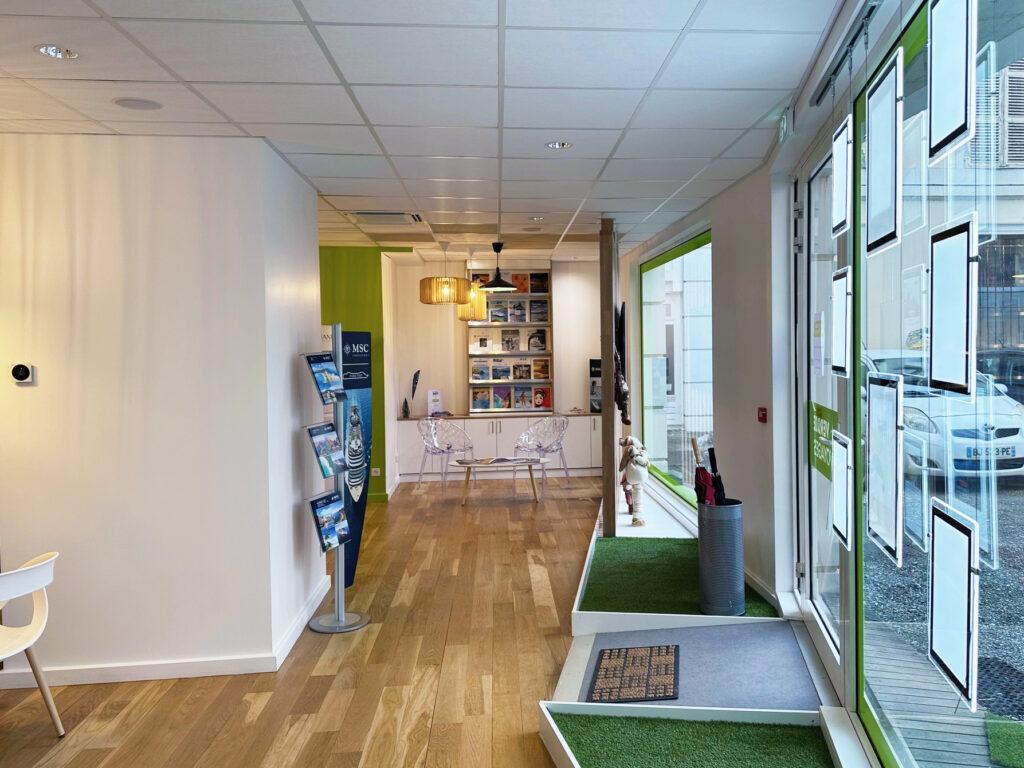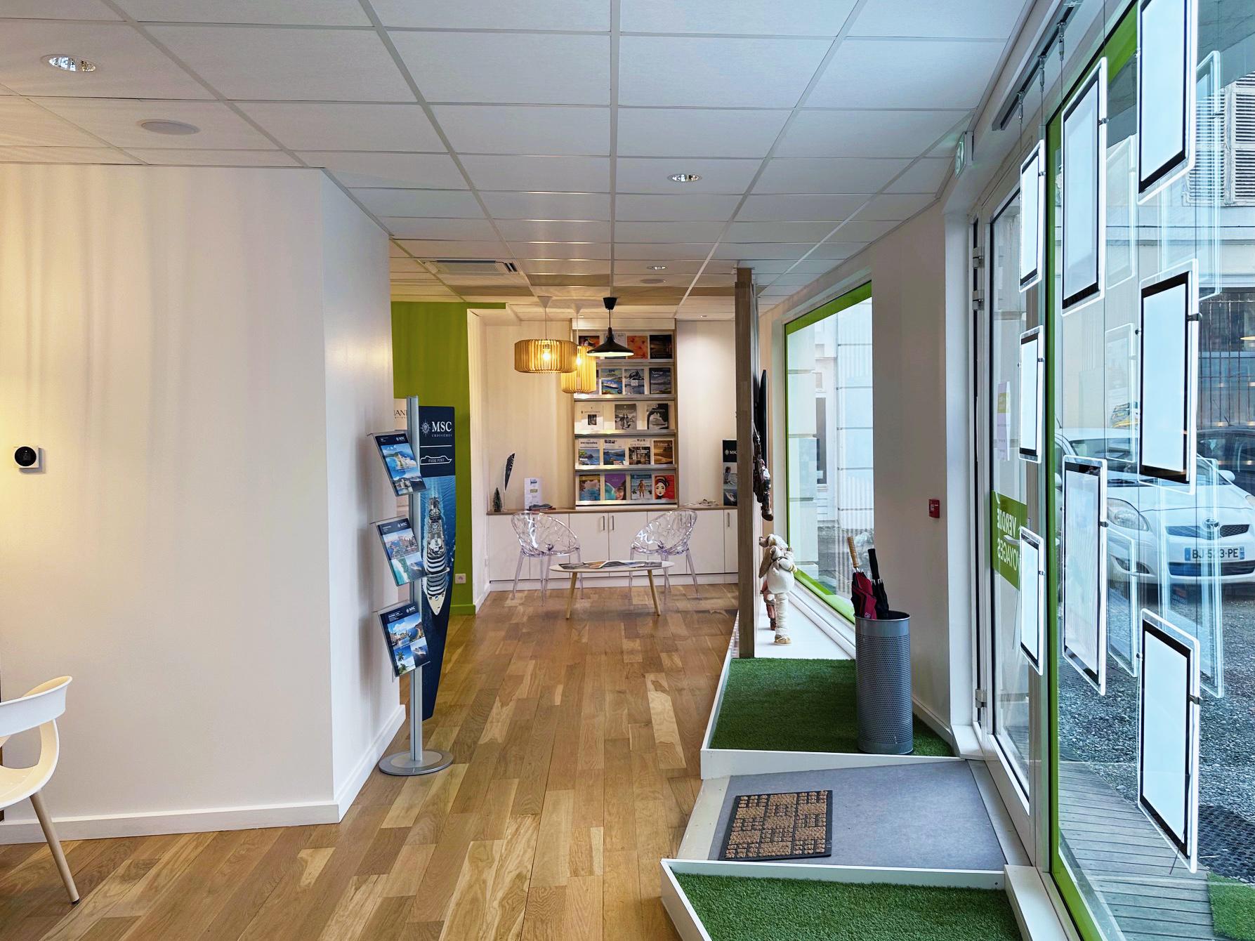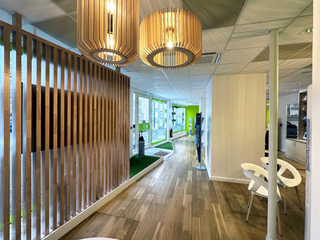 Rénovation du parquet d’origine, création d’un faux plafond en dalles, cloisonnement de l’espace, installation d’une climatisation, création de mobilier sur mesure, et agencement des vitrines.