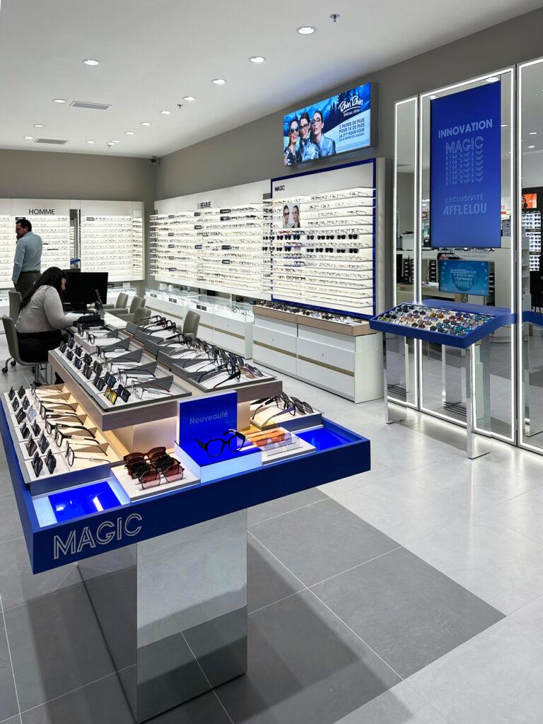 Accompagner l’enseigne Alain Afflelou dans le transfert et l’agencement complet de son nouveau point de vente au sein du Centre Commercial Blagnac 2. Forts d’une première collaboration réussie sur l’ancienne boutique, nous avons eu le plaisir de concevoir un espace plus vaste, plus moderne et idéalement situé pour optimiser l’expérience client.