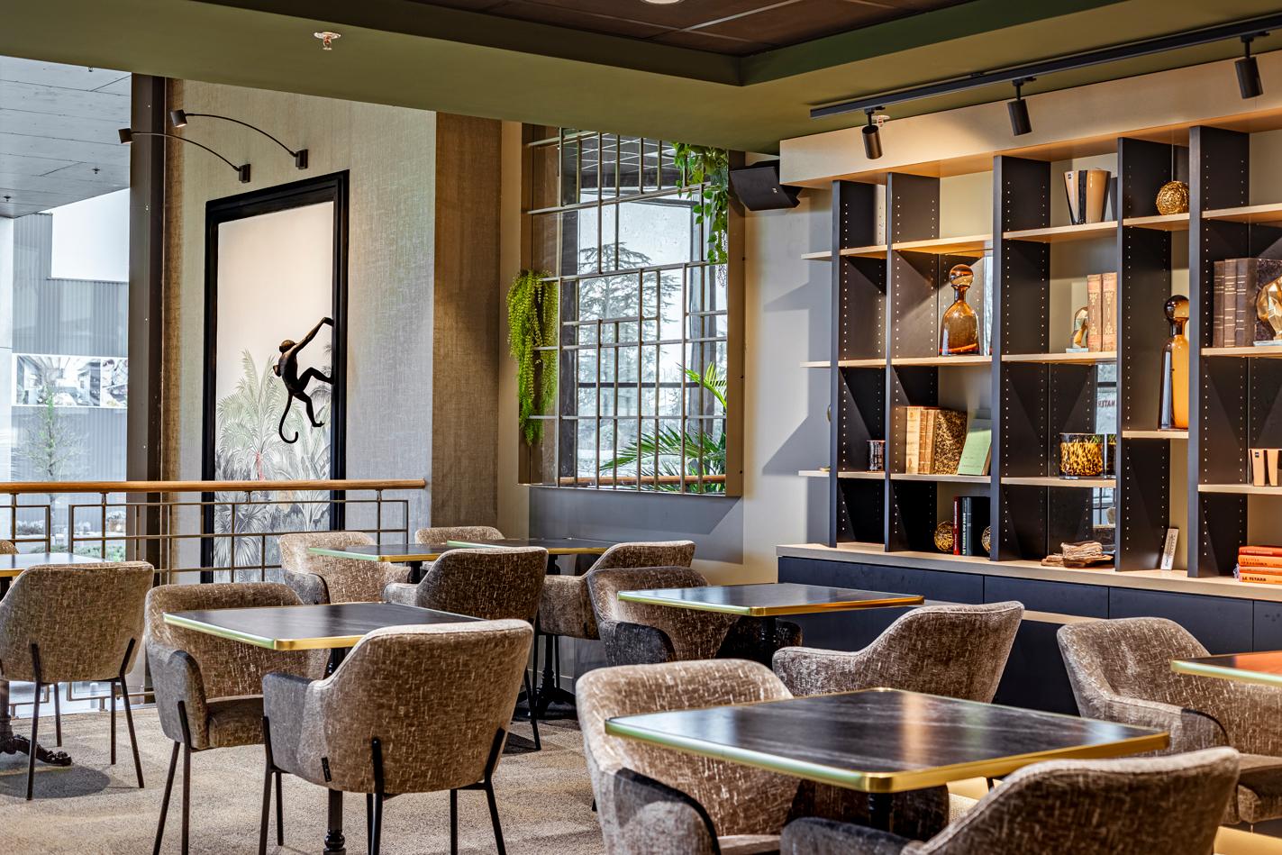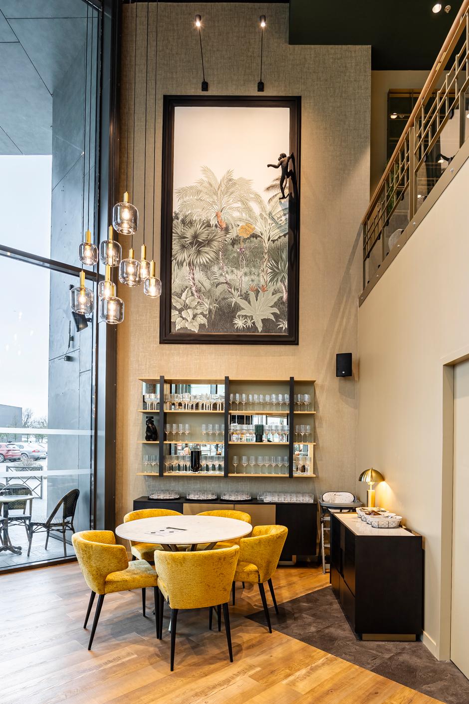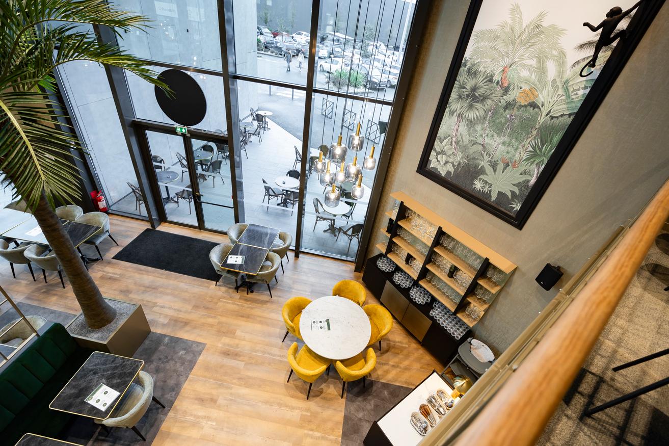 luminaires suspendus et de palmiers, dialogue avec une mezzanine plus confidentielle. Le projet met en