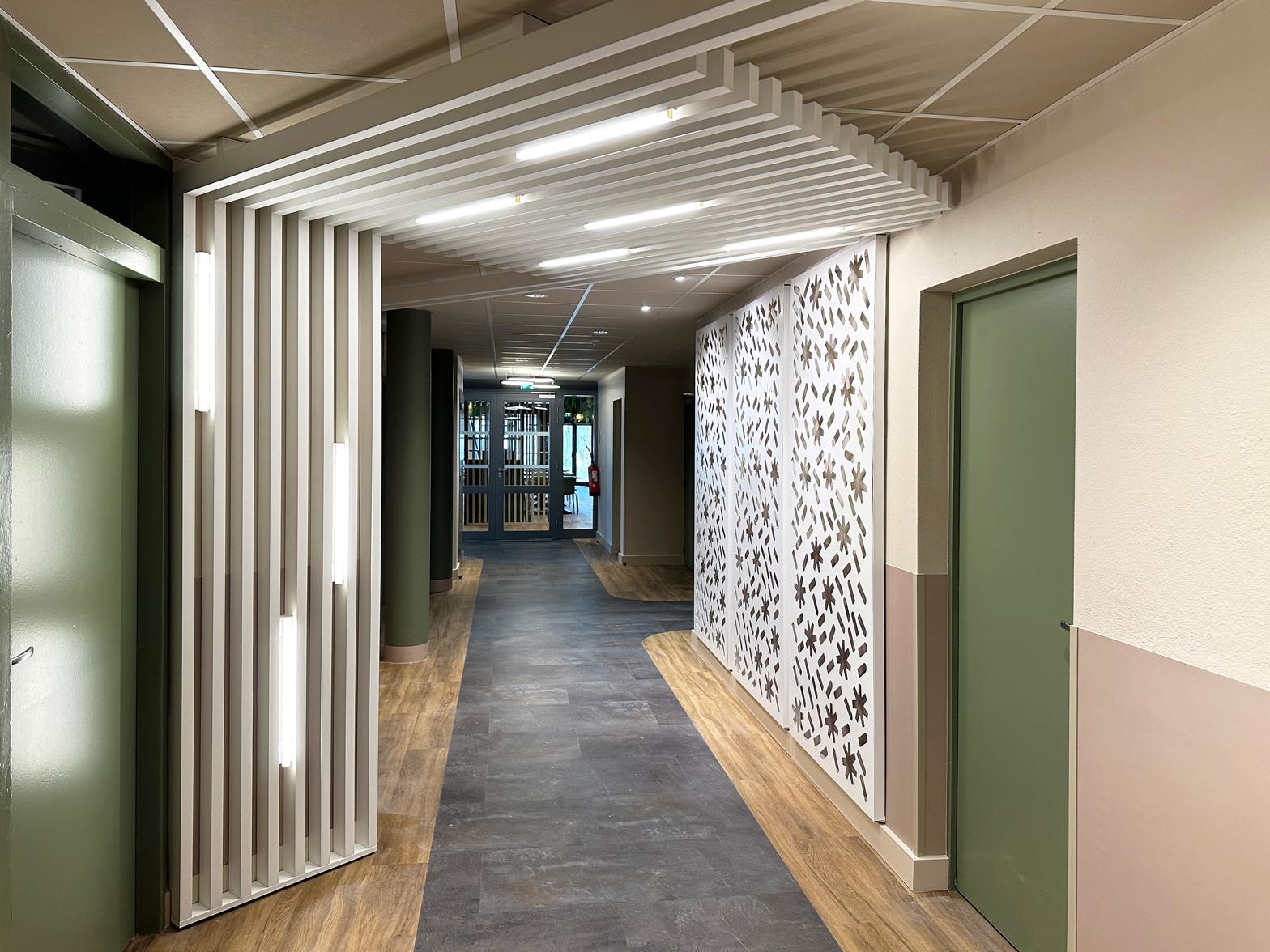 Des claustras métalliques inspirés du nouveau logo ajoutent une dimension esthétique, tandis que des claustras en bois rythment les cheminements tout en révélant des touches de lumière.