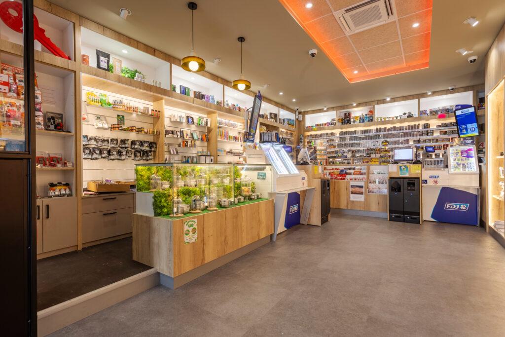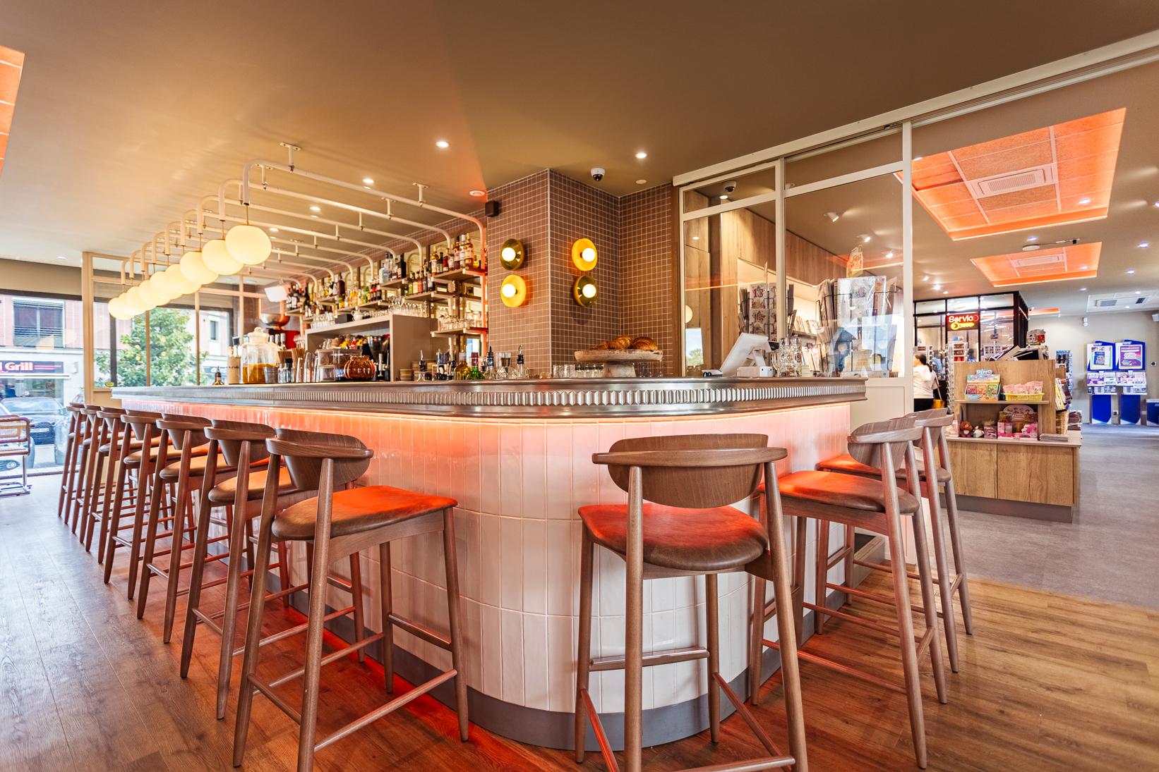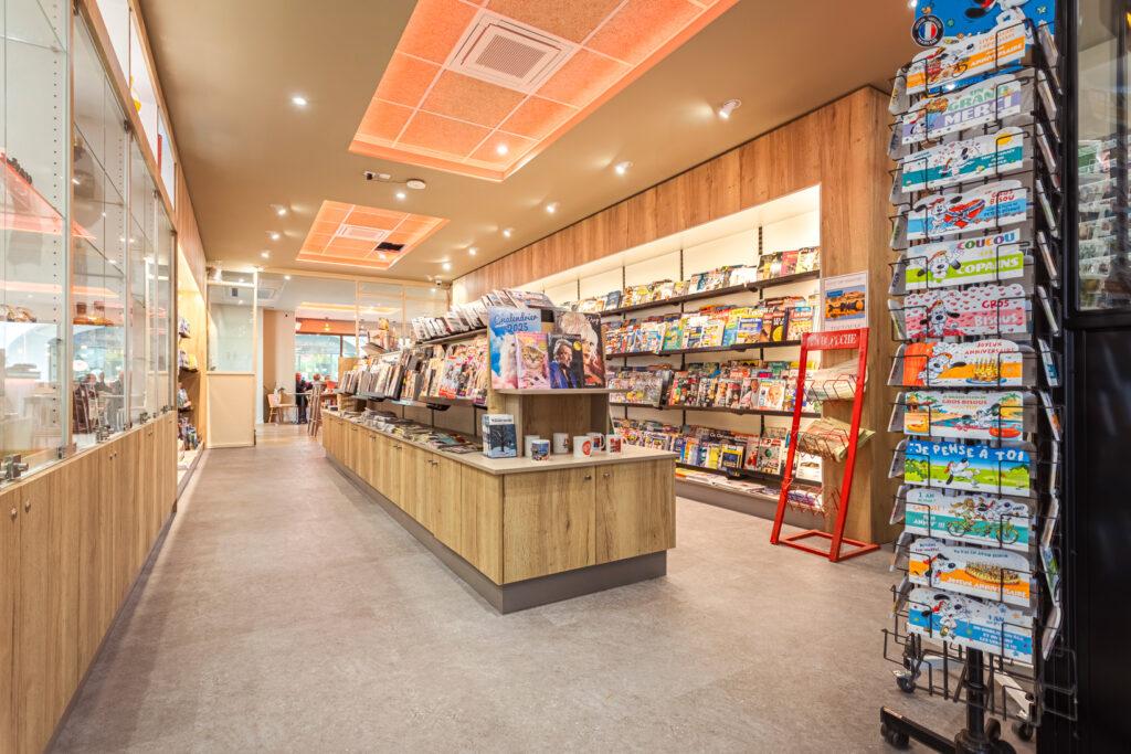 Les espaces sont agencés pour répondre aux besoins variés des visiteurs, alliant fonctionnalité, esthétique et confort. Le tabac et le magasin de presse sont en lien direct avec le bar, favorisant ainsi les échanges et la convivialité.