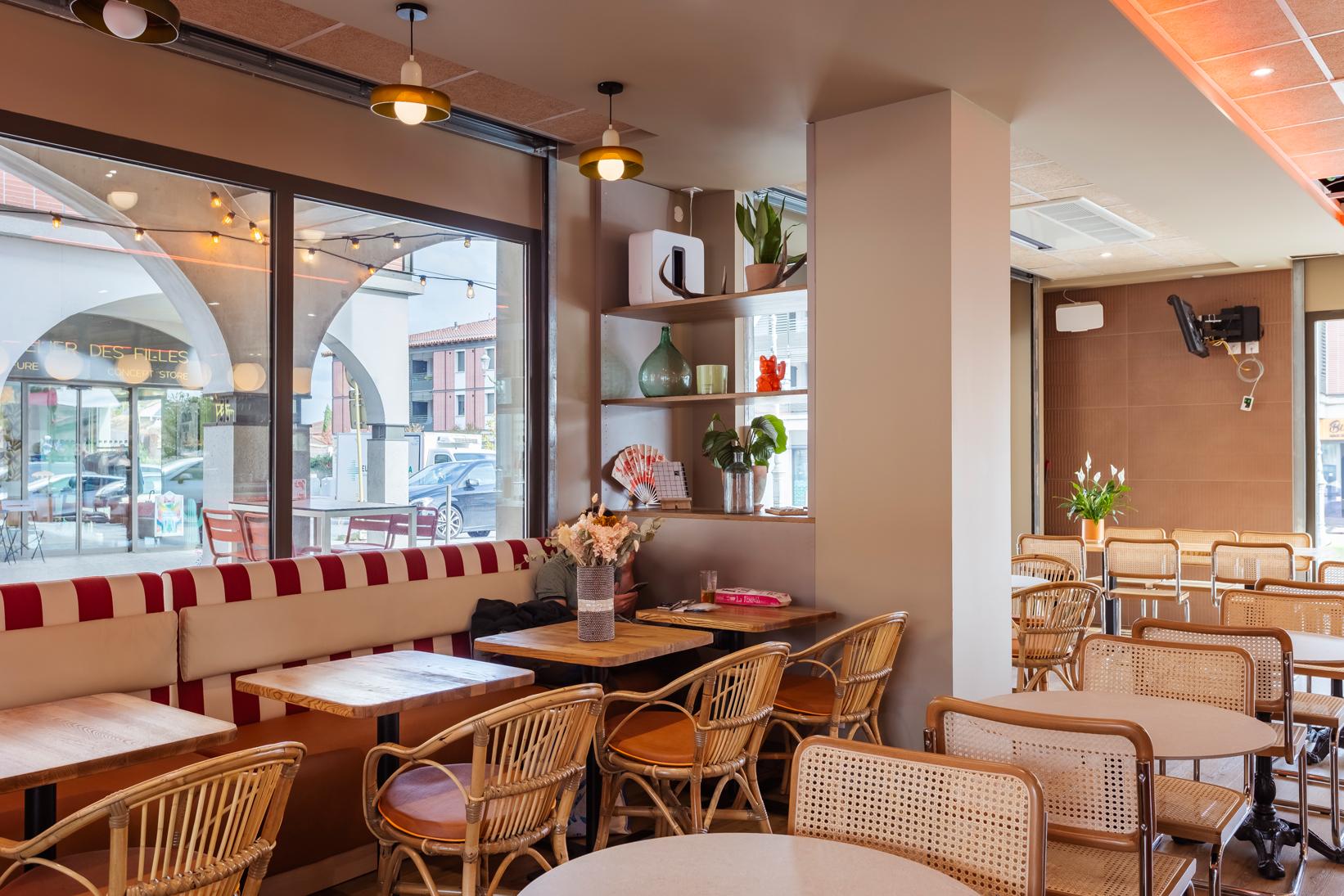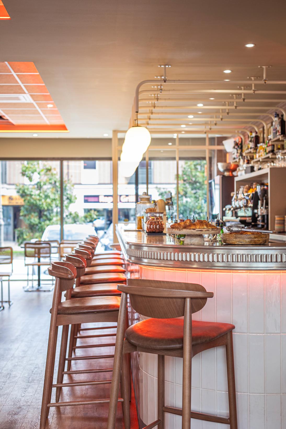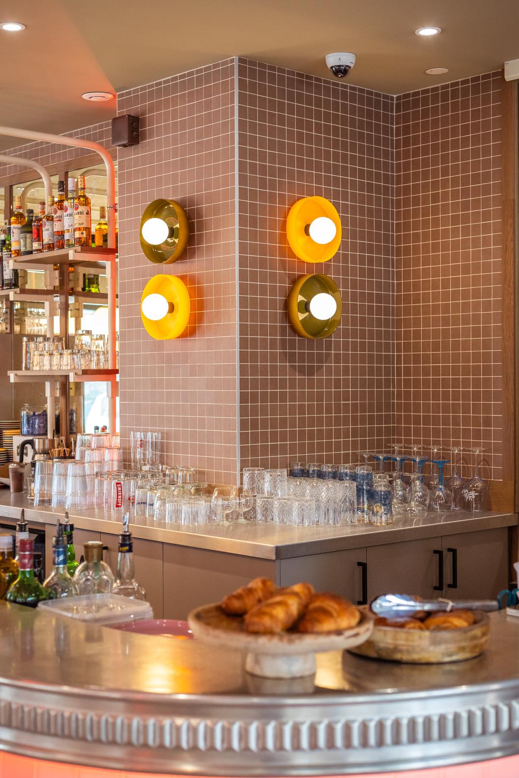Le comptoir et l’arrière-comptoir sont habillés de carreaux de faïence, de suspensions boule qui diffusent une lumière douce et d’appliques murales vintages qui ajoutent une touche de charme à l’ensemble.